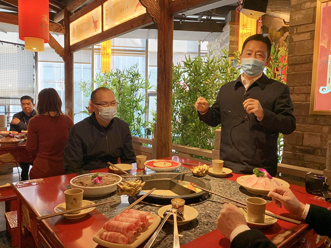 為餐飲行業(yè)打CALL!3月15日星期天中午,紅豆集團(tuán)董事局主席兼CEO周海江帶領(lǐng)集團(tuán)黨員干部來到剛剛恢復(fù)營業(yè)的無錫東港紅豆萬花城蜀大俠火鍋店,通過測溫、掃錫康碼包括手部消毒后進(jìn)入店堂點餐消費,以實際消費行動支持中小企業(yè)的復(fù)蘇。