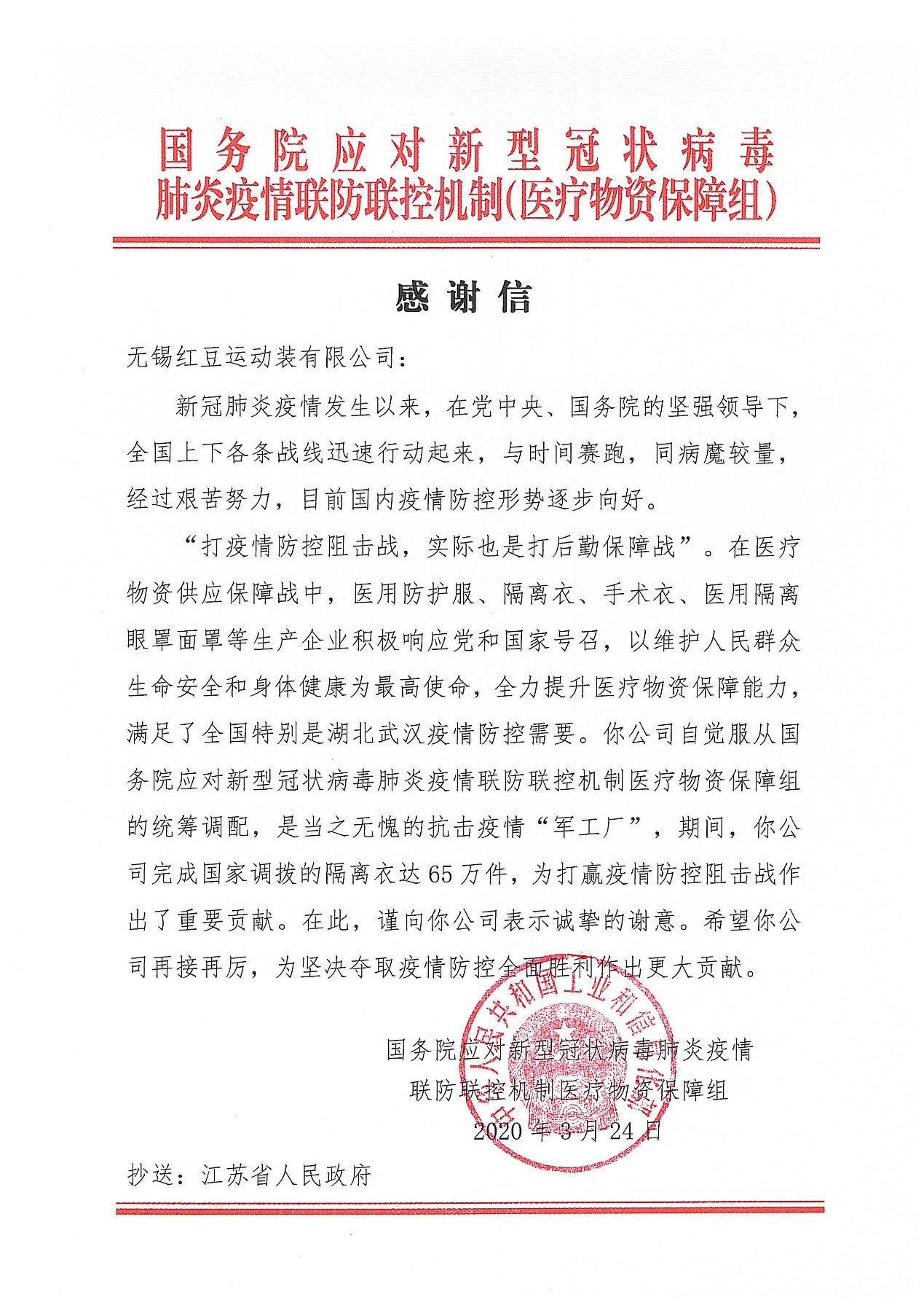 因為紅豆在抗擊疫情中作出的貢獻(xiàn),國務(wù)院應(yīng)對新型冠狀病毒肺炎疫情聯(lián)防聯(lián)控機(jī)制(醫(yī)療物資保障組)給紅豆發(fā)來感謝信,稱贊紅豆為抗擊疫情當(dāng)之無愧的“軍工廠”。9月8日,在全國抗擊新冠肺炎疫情表彰大會上,周海江榮獲 “全國抗擊新冠肺炎疫情先進(jìn)個人”“全國優(yōu)秀共產(chǎn)黨員”兩項殊榮,是同時獲得兩項殊榮的唯一民營企業(yè)家。
